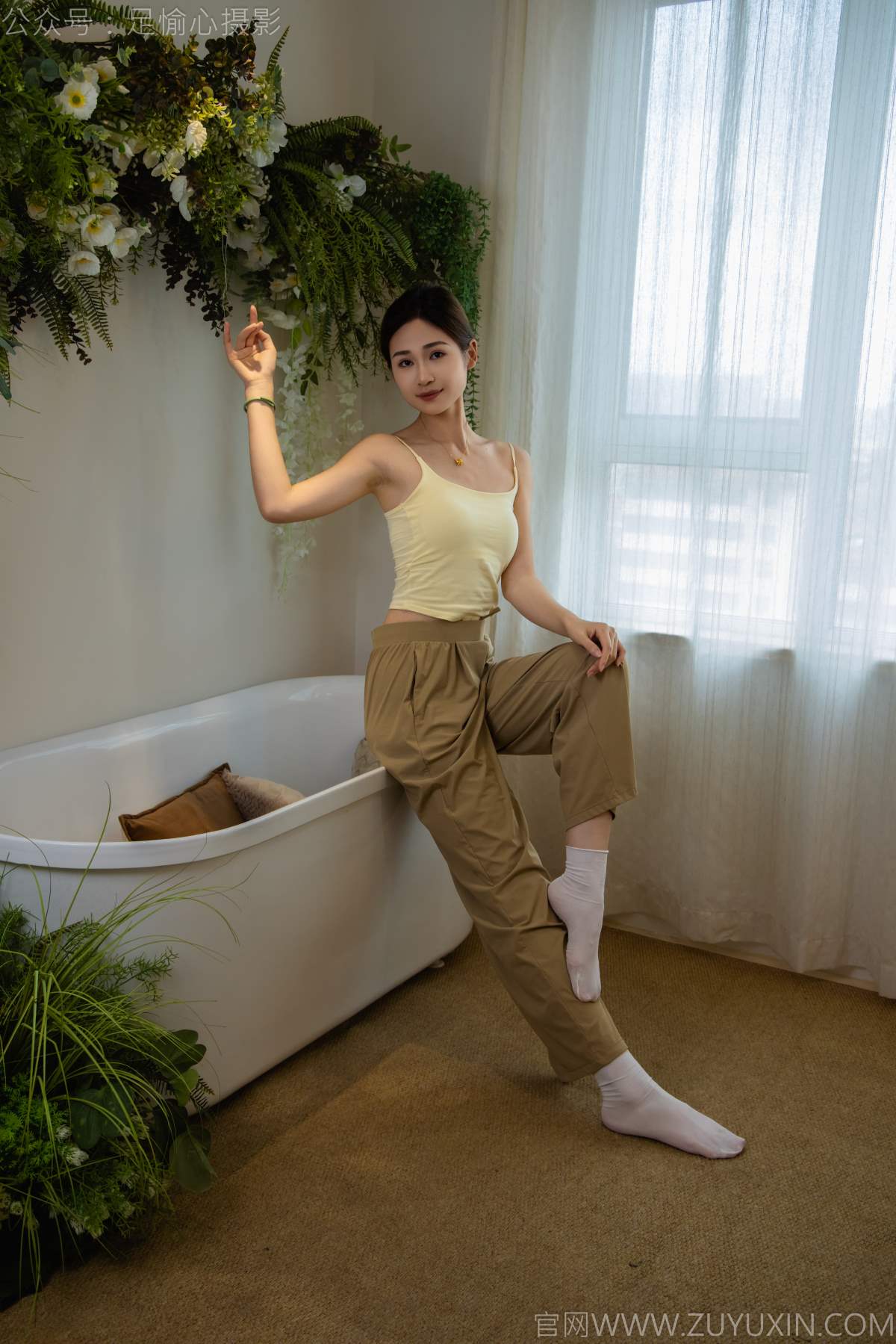 足愉心 NO.052 沐晴(搭配:白色吊带、棕色长裤、白色丝袜、运动鞋、裸足)